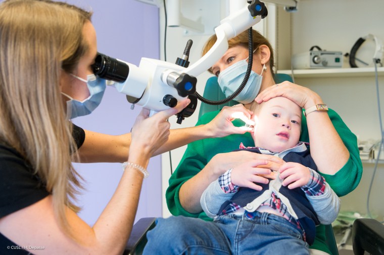 Il doit s’assurer de la bonne audition de l’enfant. Si l’enfant présente une certaine malaudition, le développement du langage se fera plus difficilement. Il est donc important de contrôler régulièrement l’audition, le cas échéant, de mettre des drains transtympaniques, voire conseiller un appareil auditif en fonction du type de malaudition.